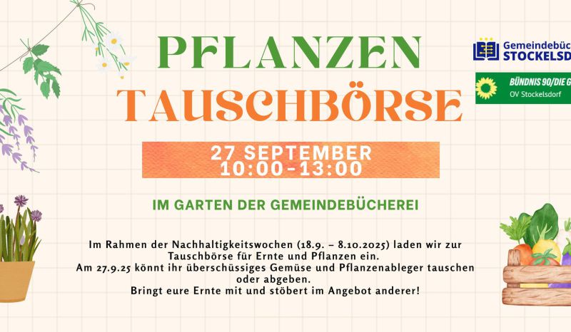 Im Rahmen der Nachhaltigkeitswochen veranstalten wir am Samstag, den 27. September, eine Pflanzentauschbörse im Garten der Gemeindebücherei Stockelsdorf. Von 10 bis 13 Uhr habt ihr die Gelegenheit, eure überschüssigen Pflanzen und eure Ernte mit anderen zu tauschen oder einfach abzugeben.